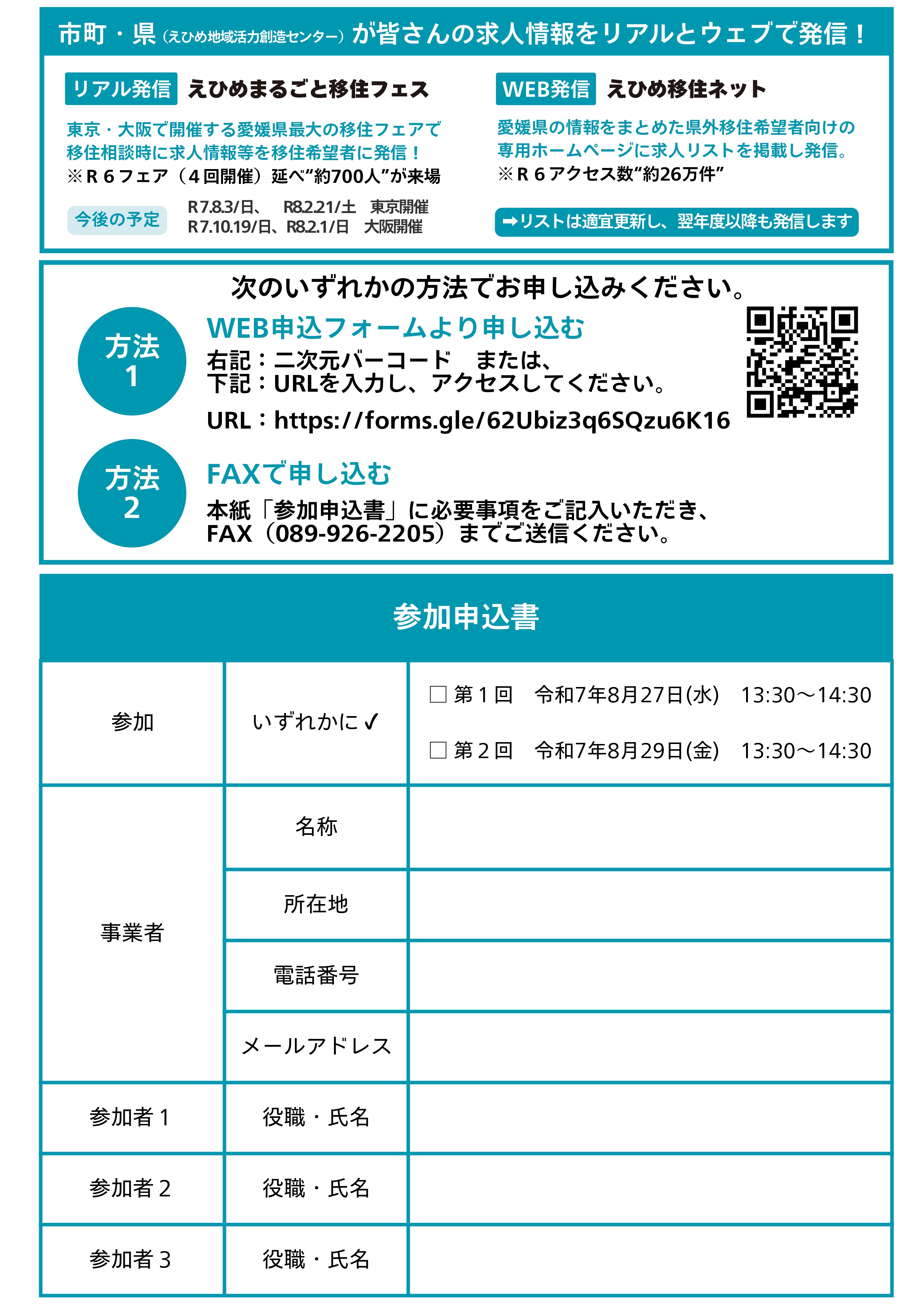 公益財団法人えひめ地域活力創造センターでは、南予地域における移住と雇用のマッチングを促進するため、商工団体の会員事業者等を対象に、県外の求職者(移住希望者)にアピールできる求人票作成や情報発信手法等を学ぶ講習会を開催します。